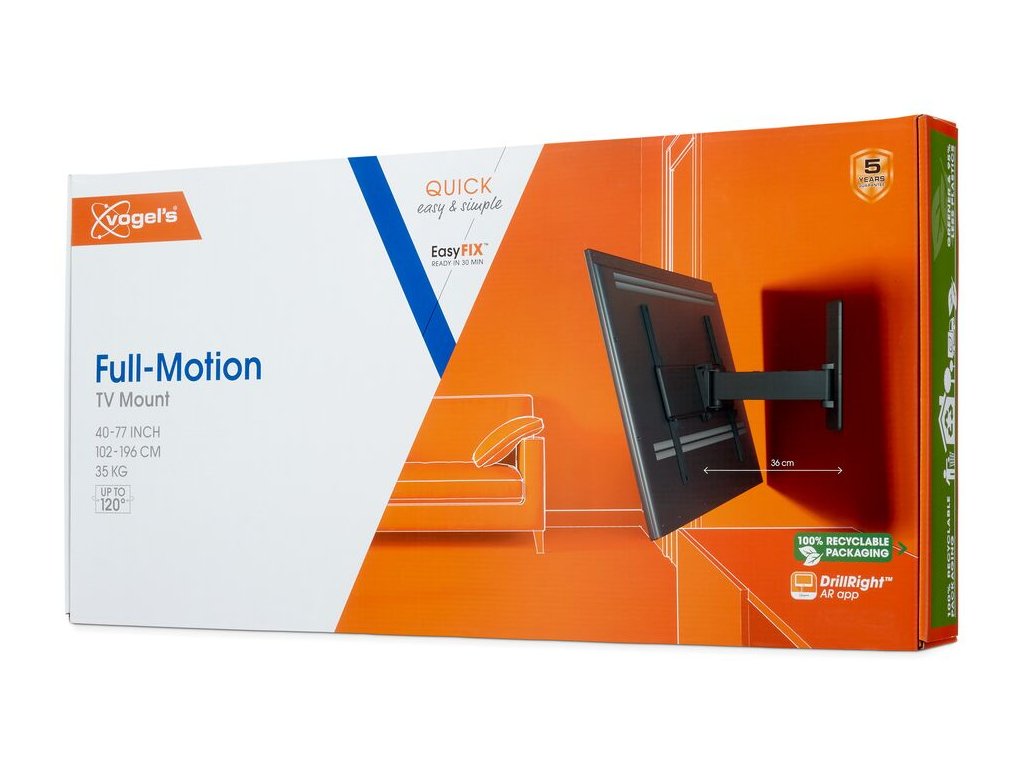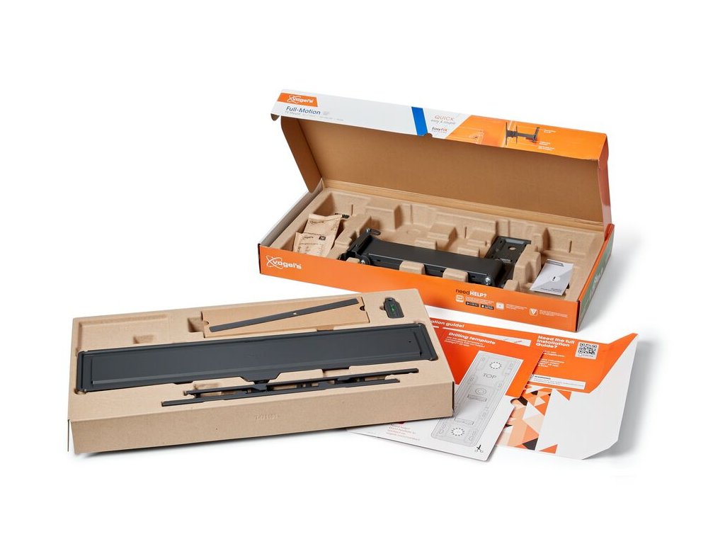 Společnost Vogel's dělá vše pro to, aby byla instalace TV držáků co nejjednodušší. Součástí balení je také vrtací šablona, šrouby, hmoždinky Fischer® DuoPower, vodováha a stahovací páska pro úhledné svázání kabelů. To znamená, že se můžete ihned pustit do práce. První vrtací otvor si snadno vyznačíte pomocí naší bezplatné aplikace DrillRight™ AR. Pokyny k instalaci jsou krok za krokem vysvětleny v rychlém průvodci instalací. Pokud chcete, můžete si také prohlédnout podrobný návod nebo instalační video online.