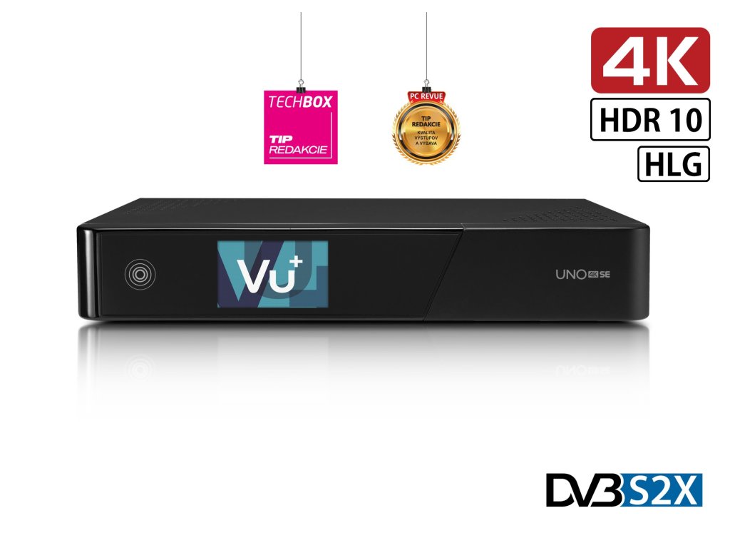 Vu + Uno 4K SE je nový model 4K přijímače s UHD rozlišením a nejnovějšími obrazovými normami HDR10 a HLG.Přijímač je vybaven LCD displejem 2,4 "palce a dvoujádrovým ARM procesorem s frekvencí 1,7 GHz (12000 DMIPS) doplněný o 2GB DDR4 operační paměti a 4GB flash paměti eMMC. Kromě 2,4" LCD displeje, který disponuje také funkcí mini TV má VU + UNO 4K sE možnost vložení pevného disku o velikosti 2,5 "do výměnného šuplíku, který se nachází na zadní straně přijímače.
