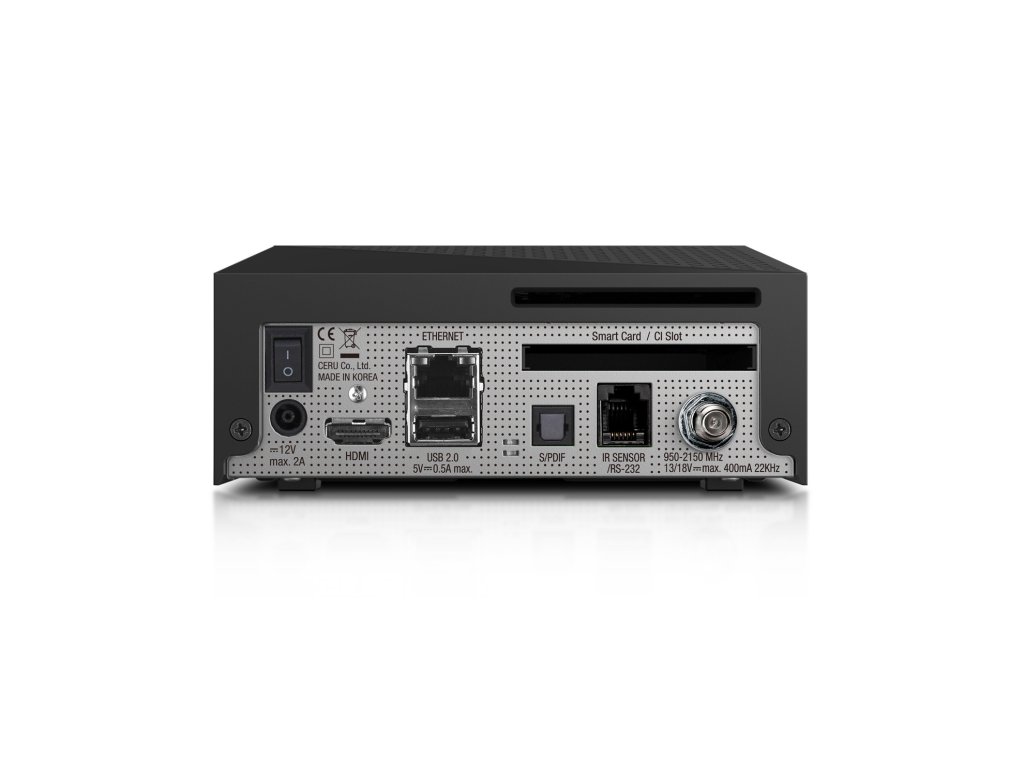 Na zadní straně nechybí ethernet port, HDMI 2.0, USB port USB 2.0 a port pro připojení externího IR čidla. Možnost doložení externího PVR Kitu pro nahrávání na inetrní úložiště HDD.