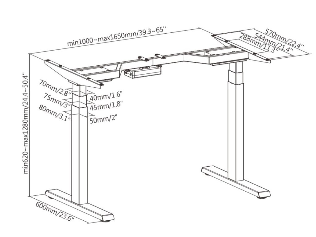 Výškově stavitelná stolová podnož Brateck M08-23DE 2 motory rozsah 620-1280 mm nosnost 100 kg