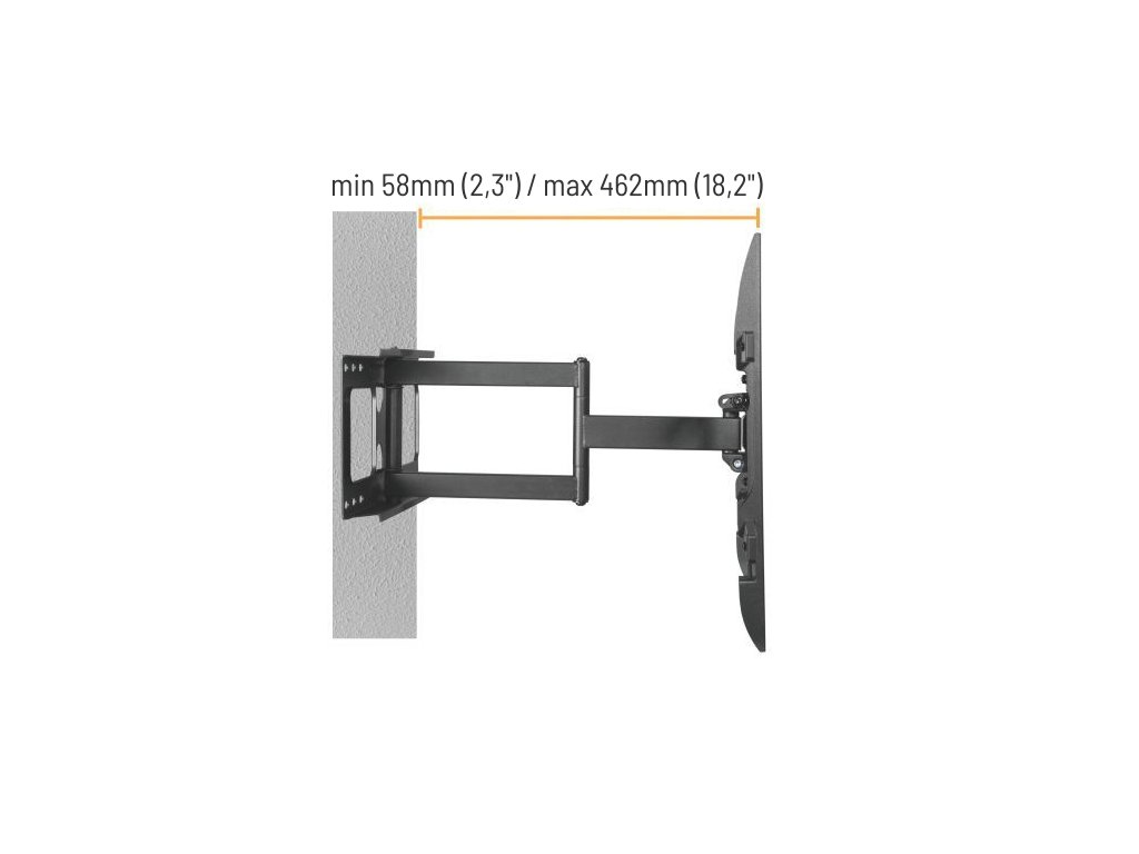 Výsuvný nástěnný držák LPA69-463D je určen pro instalaci TV s plochou obrazovkou s úhlopříčkami od 32“ do 70“. Jeho největší přednostní je robustní výsuvná konstrukce, díky níž unese TV o hmotnosti až 45 kg a zároveň umožňuje nastavit vzdálenost TV od stěny v rozsahu 58 mm až 462 mm, samozřejmostí je pak také velký rozsah polohování. Držák umožňuje snadné naklápění TV v rozsahu +5°~-15°, natočení do stran v rozsahu +90°~-90° a rotaci v rozsahu +3°~-3°, což maximalizuje flexibilitu sledování z libovolného místa v místnosti. Integrovaná svorka na kabely udržuje kabely uspořádané a chráněné.Hlavní vlastnosti: