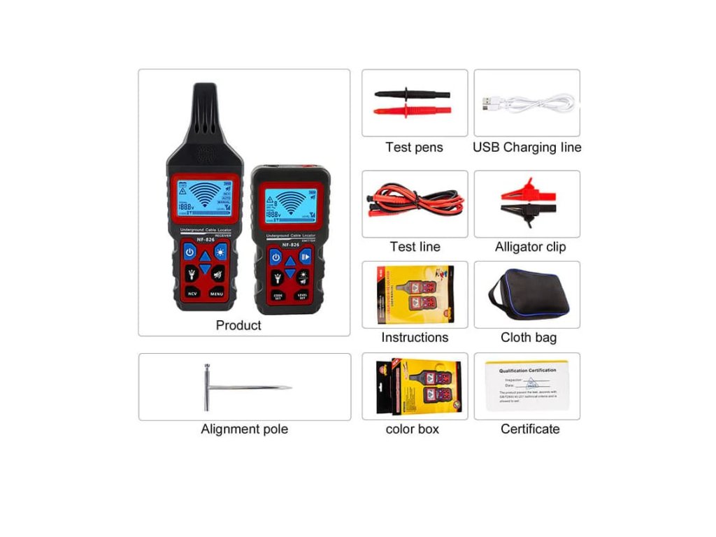 Hledačka kabelů a NCV WSNF826, voltmetr, LCD displej, délka 1000m, hloubka až 2m, AD/DC 12 - 400V.Tester vyhledá skryté kabely, vodiče a potrubí pod zemí nebo ve zdech.