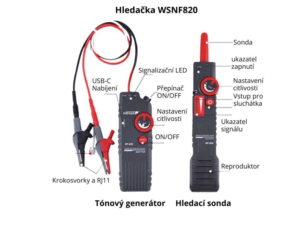 Hledačka kabelů WSNF820, délka 1000m, vzdálenost 0-2 m, 0-400V, nastavení citlivosti, AC filtr, trasování 1 a více žil. kabelů.Detektor kabelu ve zdi, v podlaze, ve stropě, traser kabelů a rozvodů pod napětím 0-400V a vzdálenosti 0 - 2m.