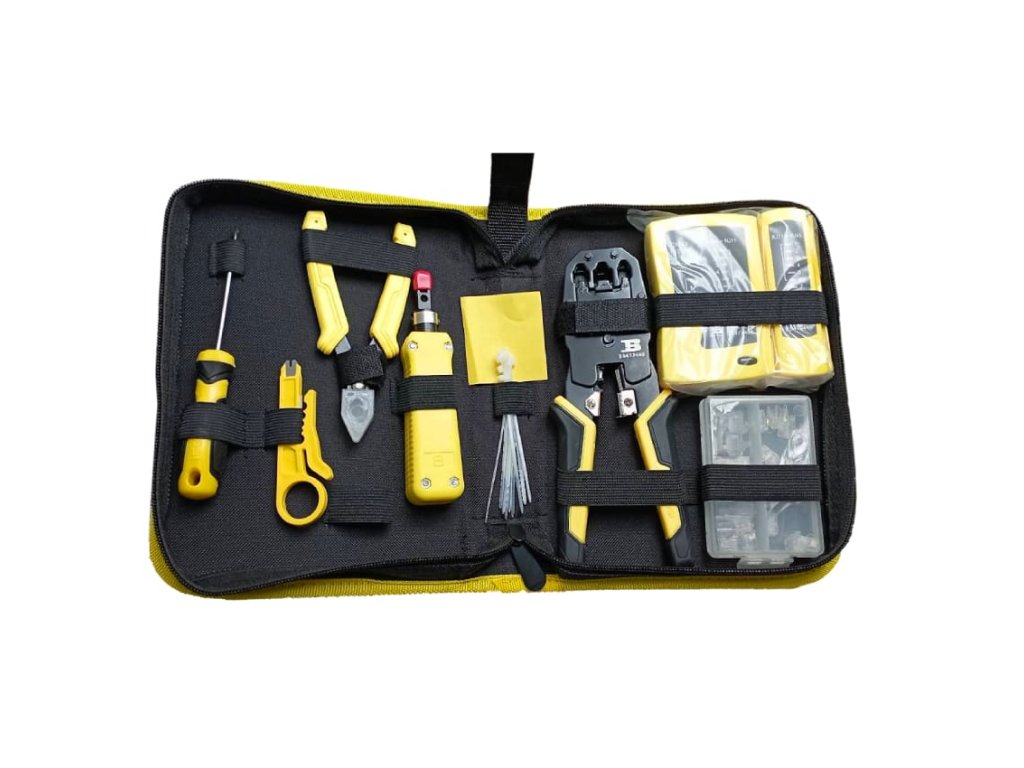 Sada nářadí pro síťaře i domácí kutily, 11ks nářadí, Tester síťových kabelů, krimpovací kleště, štípací kleště, šroubovák, konektory RJ45Sada v praktickém pouzdru obsahuje: