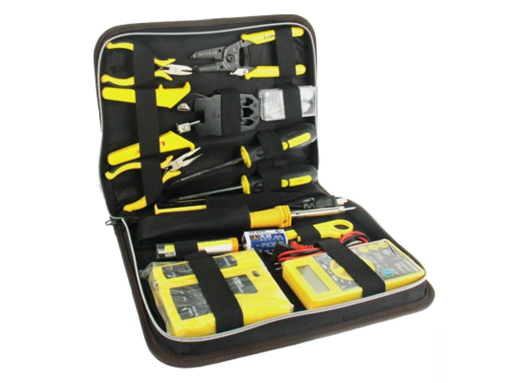 Sada nářadí pro síťaře i domácí kutily, 15ks nářadí (Tester síťových kabelů, páječka, krimpovací kleště, multimetr, štípací kleště, šroubováky, pinzeta a další.)Sada v praktickém pouzdru obsahuje: