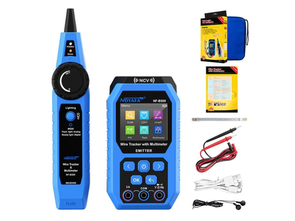 Tester síťových kabelů a multimetr WSNFB509, test POE, Port Flash, hledačka, chyby zapojení RJ45, měří délku, NCV, včetně svítilny, Multimetr - V, A, Ohm, Hz, F.Technické parametry W-Star WSNFB509: