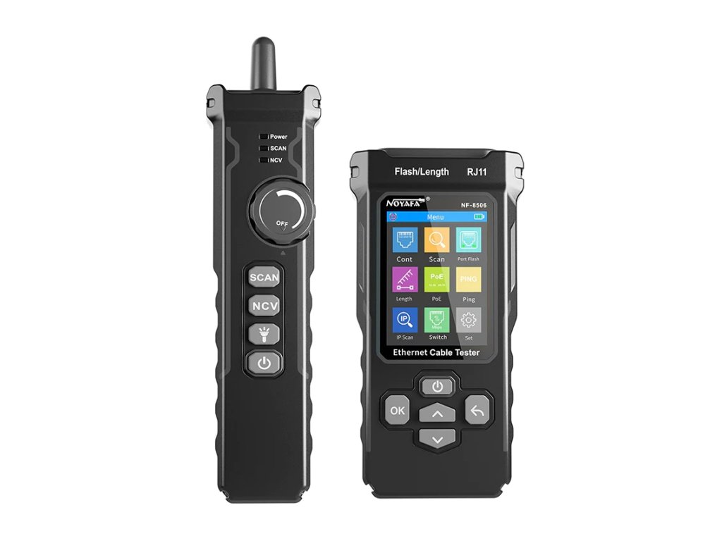 Tester NF-8506 pro zapojení kabelů RJ45, RJ11, hledačka kabelů, zkoušečka datových kabelů.Měří délku kabelu, testuje PoE, funkce Flash Port, PING, test IP, Cat5e, Cat6, Cat7, NVC.