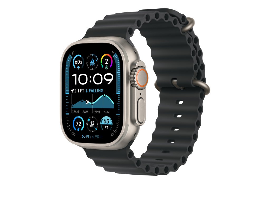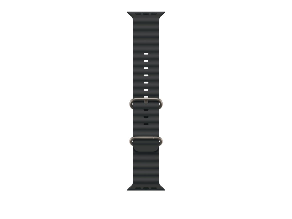 Apple 49mm Oceánský řemínek – provedení z přírodního titanuOceánský řemínek je lisovaný z vysoce funkčního elastomeru a má trubicovitou strukturu, takže se dá napnout, aby perfektně seděl i přes neopren. Díky titanové přezce a nastavitelnému poutku, které jsou přirozeně odolné proti korozi, se při vysokorychlostních vodních sportech ani nehne.
