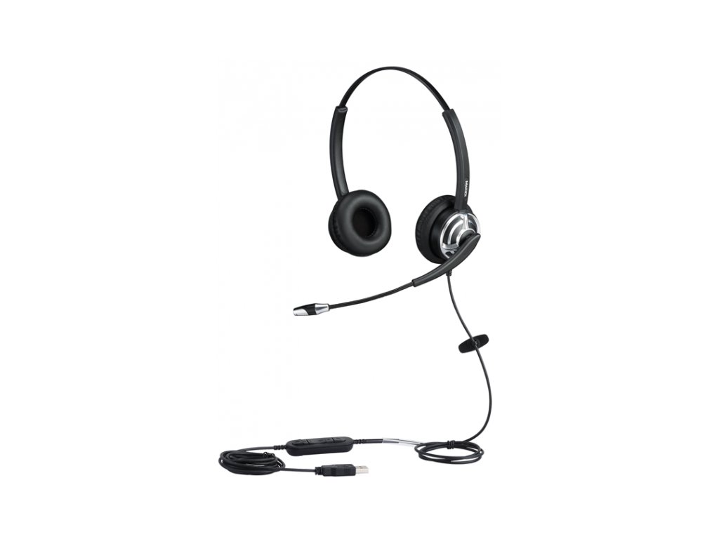 Profesionální náhlavní souprava v novém designu, kvalitnější odhlučnění, příjemnější materiál, s ovládacími tlačítky na kabelu soupravy, USB konektor.Jednosměrový otočný mikrofon