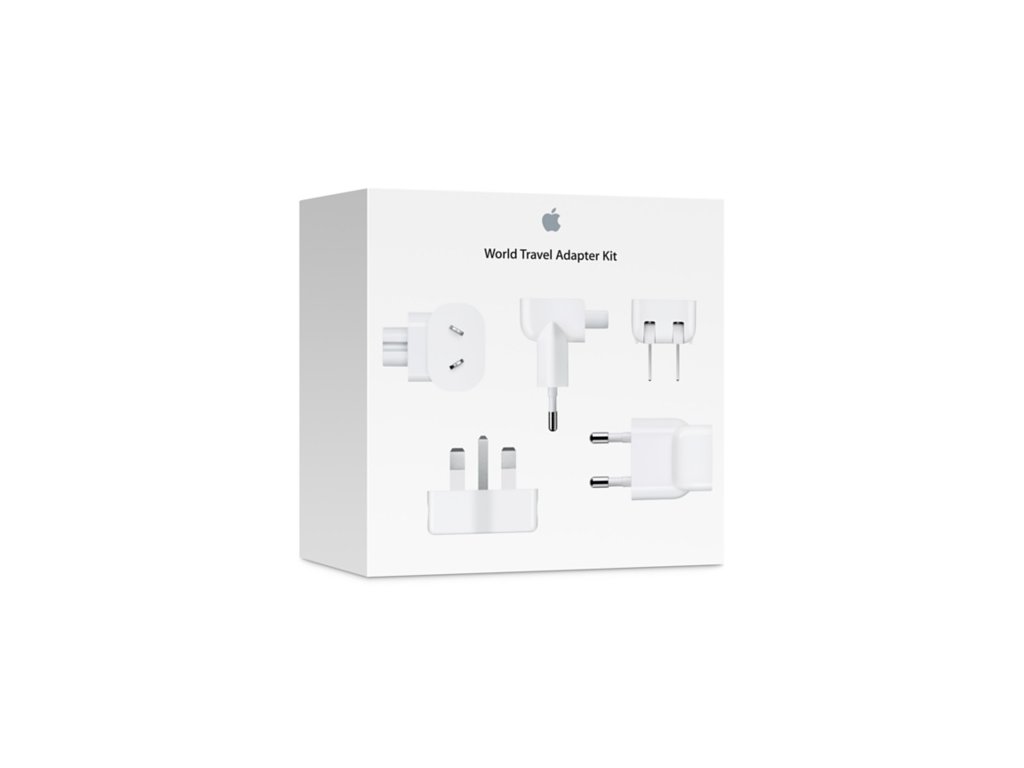 World Travel Adapter KitSouprava cestovních adaptérů Apple obsahuje sedm zástrček do různých elektrických zásuvek po celém světě. Příslušná geografická oblast je laserem označená na každé zástrčce. Tato souprava umožňuje cestovatelům připojení k elektrické síti ve většině zemí světa.