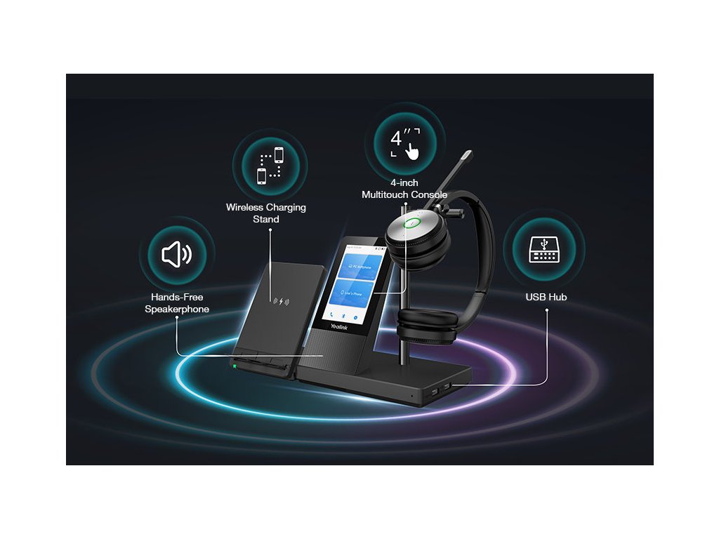 Yealink WH66 DUAL je špičková bezdrátová DECT náhlavní souprava na obě uši, která otevírá zcela nové možnosti na pracovním stole. Je to více než jen základna pro náhlavní soupravu, usnadňuje správu požadavků na obchodní komunikaci a dalších USB zařízení. Poskytuje také velkou flexibilitu se sadou integrovaných funkcí, které vám usnadní každodenní rutinu.UC Workstation dává uživatelům možnost bezproblémové práce s hlavními UC platformami a nativní integraci s Yealink IP telefony. 4 palcová (480 x 800) kapacitní dotyková obrazovka základny nabízí nové pracovní zkušenosti, pouze jeden dotyk ovládá všechno. Je to pracovní stanice, spravuje telefonní hovory, připojí se k více zařízením (stolní telefon/mobilní telefon/počítač), bezdrátově nabíjí mobilní telefon a dokonce vše přehrát na hlasitý reproduktor. Nejlepší ze všeho je, že k nasazení takové multifunkční pracovní stanice stačí pouze přímé připojení bez dalších krabiček.