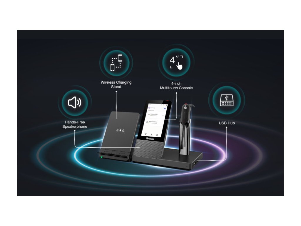UC Workstation dává uživatelům možnost bezproblémové práce s hlavními UC platformami a nativní integraci s Yealink IP telefony. 4 palcová (480 x 800) kapacitní dotyková obrazovka základny nabízí nové pracovní zkušenosti, pouze jeden dotyk ovládá všechno. Je to pracovní stanice, spravuje telefonní hovory, připojí se k více zařízením (stolní telefon/mobilní telefon/počítač), bezdrátově nabíjí mobilní telefon, a dokonce vše přehrát na hlasitý reproduktor. Nejlepší ze všeho je, že k nasazení takové multifunkční pracovní stanice stačí pouze přímé připojení bez dalších krabiček.