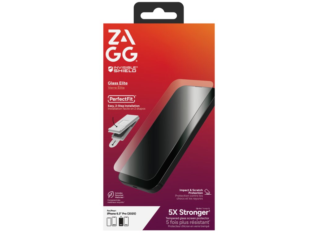 ZAGG Ochranné sklo Elite pro Apple iPhone 17 ProUltra silné tvrzené sklo pro ochranu vaší obrazovky. Chraňte svoji obrazovku před poškrábáním a poškozením při nárazu s ochranným tvrzeným sklem Glass Elite. Glass Elite je aluminosilikátové sklo s technologií iontové výměny, až 5x pevnější než běžná ochranná skla. Glass Elite je obohacené povrchovou úpravou ClearPrint™, díky které jsou otisky prstů neviditelné, když je obrazovka zapnutá. Snadno se aplikuje díky aplikační sadě EZ Apply™ snadná, jednoduše sklo vyrovnáte na vaše zařízení. Je vyrobeno ze 30 % z recyklovaného skla. Díky recyklovatelným obalům vyrobeným ze 100 % recyklovaných materiálů získal Glass Elite certifikaci FSC, organizace pracující na ochraně zdravých lesů a certifikaci TÜV Rheinland.