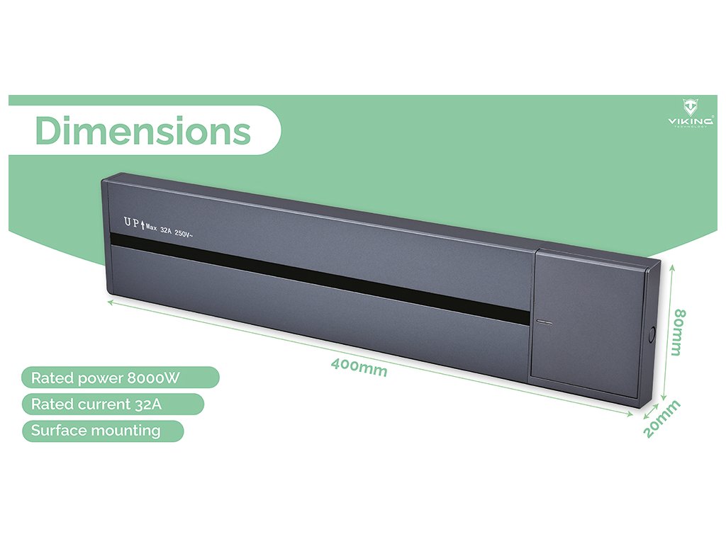 Zásuvková lišta - povrchová montáž • kompaktní rozměry 8 x 2 x 40 cm • připojení až 5 zásuvkových modulů • napájení 230V, 50Hz • ideální pro domácí i kancelářské využití • jmenovitý proud 32 A • robustní hliníková slitina • jmenovitý výkon 8000 W • ochrana IP20 • izolační napětí 500V • snadná manipulace a individuální uspořádání modulů v zásuvkové liště"Váš prostor, váš styl, vaše zásuvky - vždy podle vašich představ a nálady!"