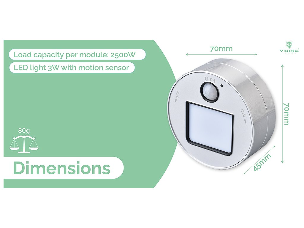 Zásuvkový modul • kompaktní rozměry 7 x 7 x 4,5 cm • LED světlo 3W s pohybovým senzorem • přípojkový konektor 230V, 16A, 50Hz • ideální pro domácí i kancelářské využití • robustní a odolný design • snadná manipulace a individuální uspořádání modulů v zásuvkové liště"Váš prostor, váš styl, vaše zásuvky - vždy podle vašich představ a nálady!"