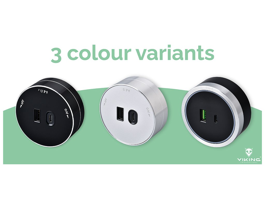 Zásuvkový modul Viking A60 je vybaven jedním USB-A výstupem (5V/2,4A) a jedním USB-C výstupem (5V/3,6A, PD) a je k dispozici ve třech barevných variantách.