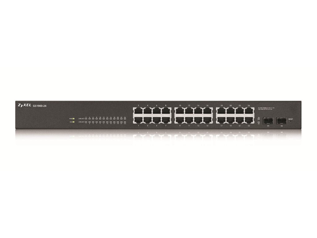 ZyXEL GS1900-2426-port Gigabit Web Smart switch: 24x Gigabit metal + 2x SFP, IPv6, 802.3az (Green), Easy set up wizard, fanless, 19" rackmount