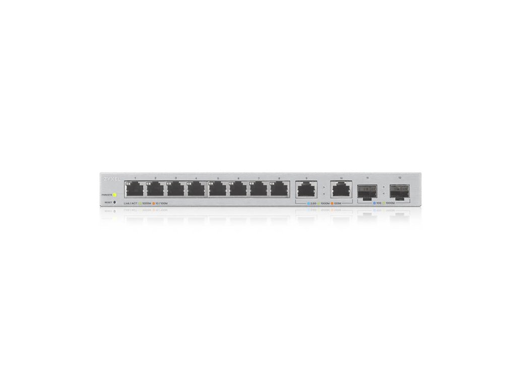 Přepínač Zyxel XGS1210-12 má dva 10-gigabitové SFP+ uplink porty, dva 2.5-gigabitové porty a osm gigabitových Ethernet portů. Pokud chcete maximální rychlost bezdrátového připojení, do 2.5-gigabitových portů zapojte přístupové body standardu 802.11ac nebo 802.11ax. Pomocí 10-gigabitového SFP+ portu zajistíte rychlý přenos dat z úložiště nebo jiného síťového prvku do vašich klientských zařízení. Součástí přepínače je integrované webové rozhraní pro prioritizaci, omezení a/nebo ochranu vašeho síťového provozu. Přepínač XGS1210-12 je navržen s ohledem na požadavky zákazníků, kteří chtějí jednoduchou správu své domácí nebo firemní sítě.Rozhraní